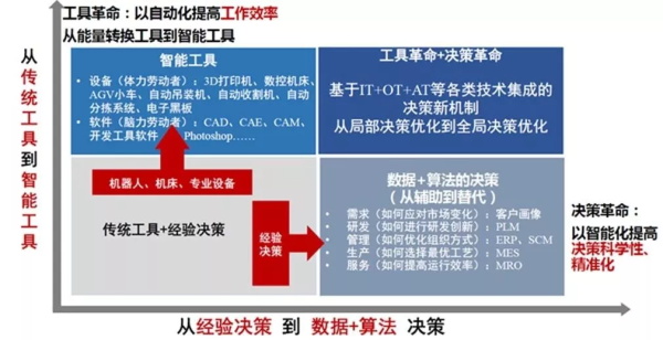 從經(jīng)濟(jì)進(jìn)步和企業(yè)發(fā)展的角度而言,智能制造顛覆了傳統(tǒng)產(chǎn)業(yè)幾百年來(lái)賴以生存的“傳統(tǒng)工具+經(jīng)驗(yàn)決策”的發(fā)展模式,掀起了在工具和決策兩個(gè)維度上的深層次革命。工具革命大幅提高了生產(chǎn)效率,而決策革命則通過(guò)人工智能等手段優(yōu)化決策的準(zhǔn)確性、及時(shí)性、科學(xué)性,實(shí)現(xiàn)真正意義上的智能化生產(chǎn)。