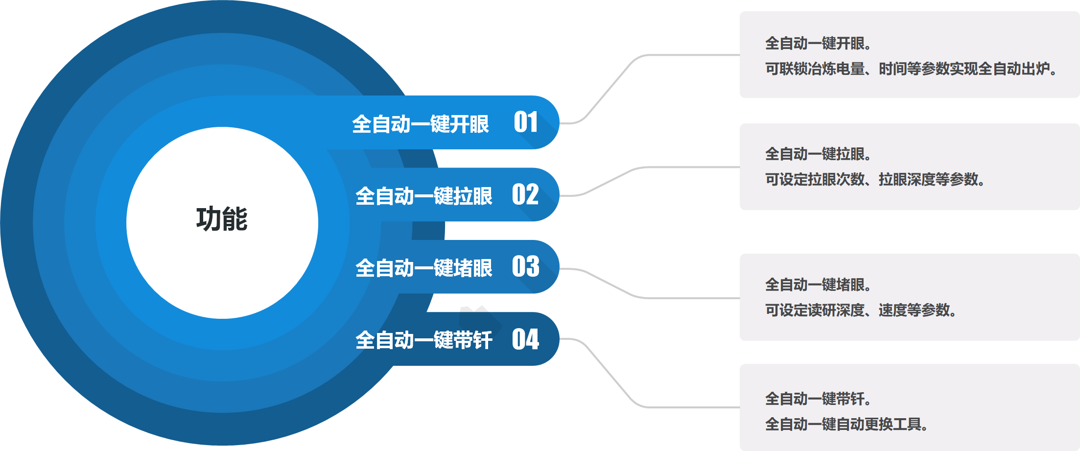 出爐操作員在遠程控制室操作控制終端,控制機器人完成一臺冶金爐的完整順序出爐操作。出爐操作員通過操縱控制終端,控制機器人完成全自動一鍵開眼、全自動一鍵拉眼、全自動一鍵堵眼、全自動一鍵帶釬等工作。